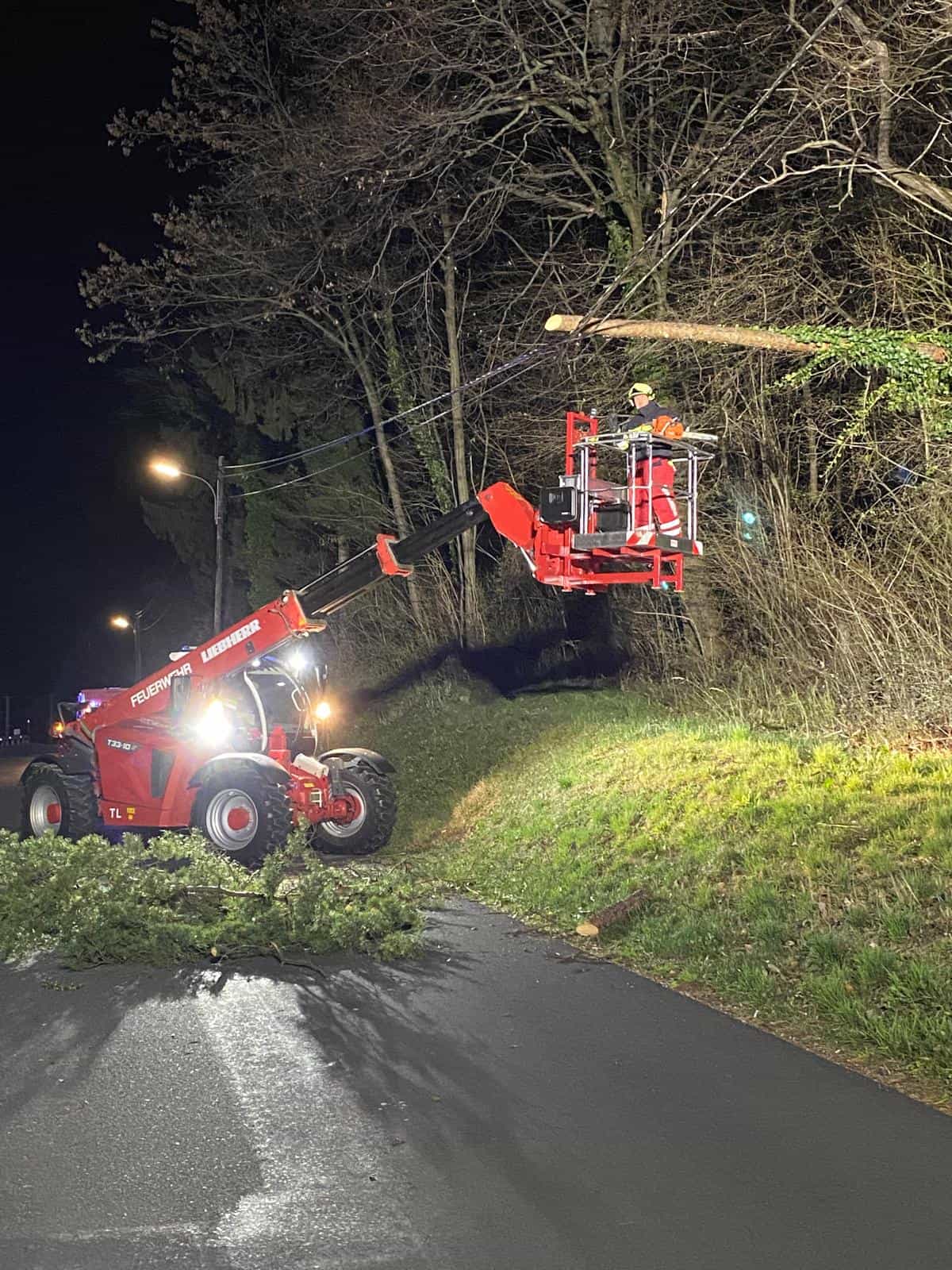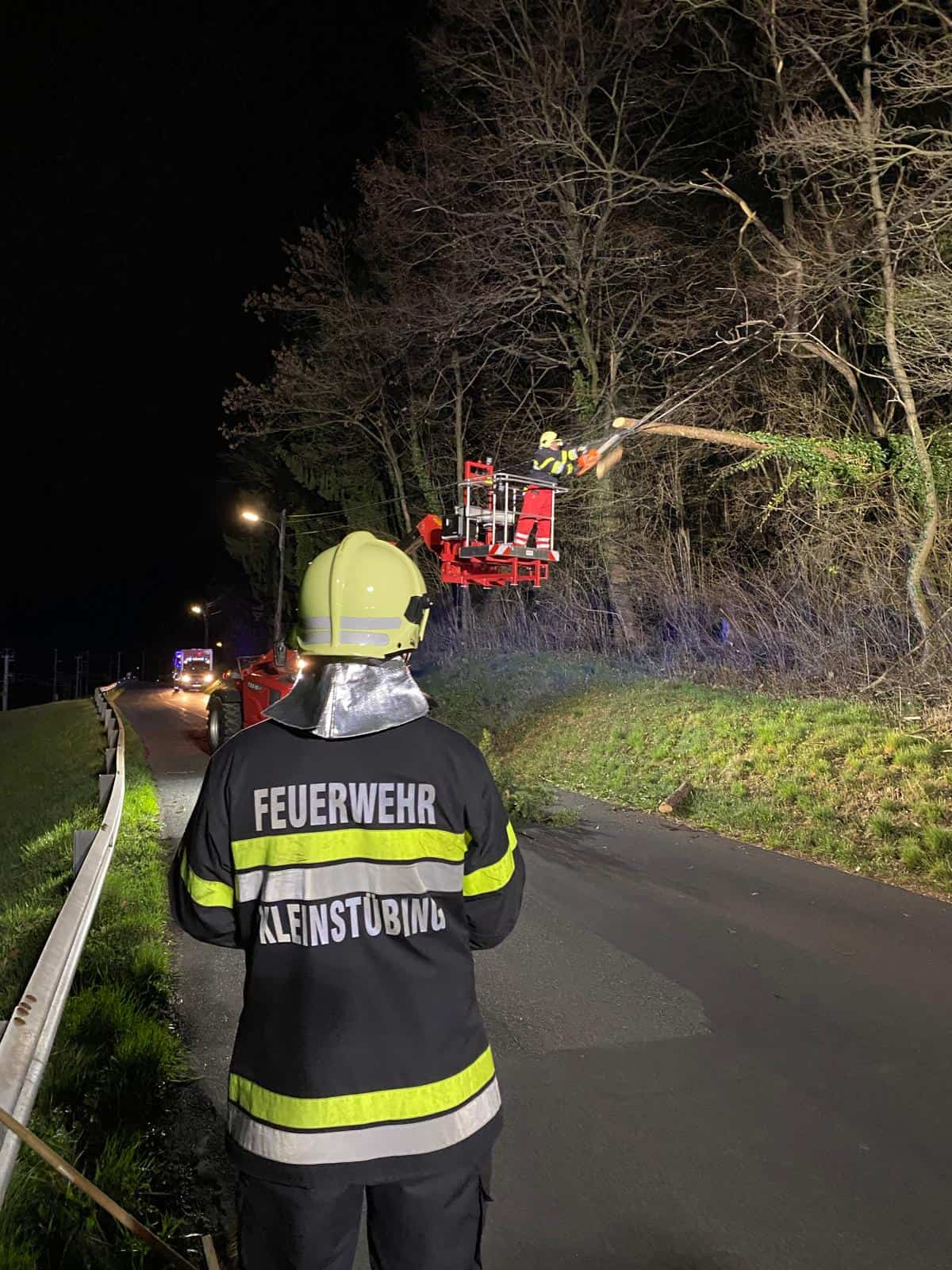Die Feuerwehr Kleinstübing führte gemeinsam mit dem Teleskoplader (Telelader) der FF Eisbach-Rein, die notwendigen Arbeiten durch. Mittels Motorkettensägen sowie unter Einsatz des Teleladers konnten die auf die Leitung gestürzten Baumteile kontrolliert entfernt werden, um weitere Schäden zu verhindern und die Gefahrenlage zu beseitigen.