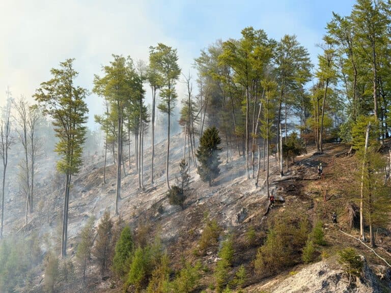 Kurz nach 12 Uhr wurde die FF Kleinstübing zu einem Waldbrand zwischen Mühlbach- und Hörgasgraben nahe der Mühlbacherhütte im Löschbereich der FF Eisbach-Rein alarmiert.